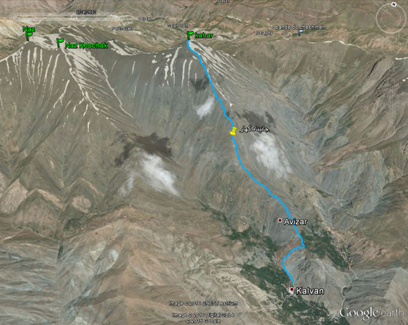 روزجمعه 21-01-94 ساعت 5:20 از تهران برای صعود قله خون کهار ازجاده مخصوص کرج وارد شهرکرج شده به سمت رجایی شهر وباغستان رفته وازآنجا به سمت روستای آتشگاه روانه شدیم ،از آتشگاه به سمت روستای دروان – مبدا صعود- حرکت کرده وساعت 6:45 به ابتدای روستا رسیدیم.در ابتدای این روستا نگهبانی وجود دارد وبرای ورود به روستا از قبل می بایست هماهنگی صورت گیرد وگرنه اجازه ورود داده نمی شود! پس از پارک ماشینها وآماده کردن کوله ها ساعت 7:00 صعود از کنار رودخانه دروان آغاز گردید.رو به شمال از سمت چپ( غرب) رودخانه با گامهای آهسته حرکت کردیم بعد از اندکی به یک دو راهی رسیدیم که تابلویی با عنوان شهید گودرزی بر سرآن نصب شده بود به سمت راست رفته و با رسیدن به اولین دره در سمت راست به طرف دیگر رودخانه رفته وسوار بر یالی شدیم که به خط الراس قله خون کهارمنتهی می شود. در ابتدای مسیر برای صرف صبحانه اطراق کردیم.پس از صرف صبحانه حرکت آغاز گردید.این یال شیب تندی داشت وبعضی از افراد را دچار چالش کرده بود.در نهایت ساعت 11:00 بر بالای این یال رسیدیم وبا ادامه مسیرساعت 12:30 بر فراز قله خون کهار بودیم.استراحتی کوتاه کرده وعکس دسته جمعی گرفتیم.ازآنجا به سمت گردنه سیادرفرود رفته ودرادامه ازشیب بسیار تندی اقدام به فرود کردیم و درنهایت ساعت 15:30 به کف دره رسیدیم.برای نهار نیم ساعتی در کنار درختان بید نشستیم.هر کسی غذای خود را در سفره گذاشت وبصورت اشتراکی ناهار خورده شد.ساعت 16:00 به سمت روستا حرکت کردیم.در ابتدای مسیر برای گذشتن از رودخانه با استفاده ازیک تنه درخت پلی ساختیم ویکی یکی از روی رودخانه خروشان گذشتیم.در نهایت بعد از گذشتن از باغات روستا ساعت 18:00 با رسیدن به کنار ماشینهایمان برنامه ای بهاری و شیرین به پایان رسید.